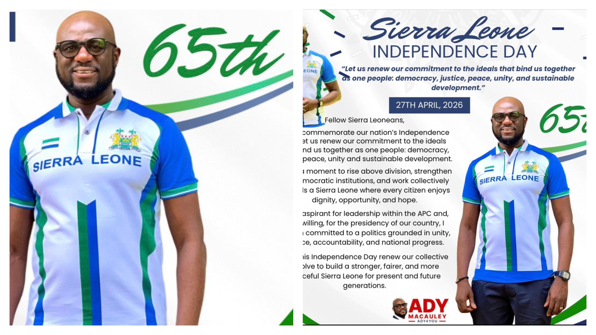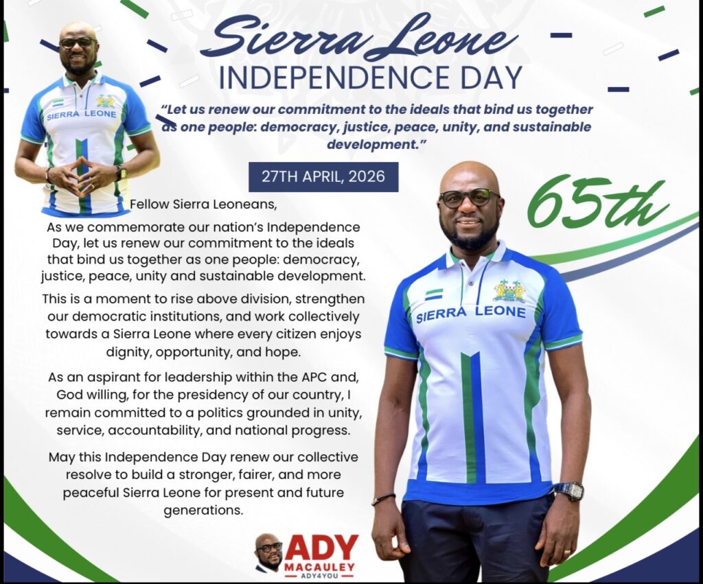 Leading All People’s Congress (APC) flagbearer aspirant, Ady Macauley, has issued a message to mark Sierra Leone’s Independence Day, urging citizens to recommit to the core values that underpin national cohesion and progress.