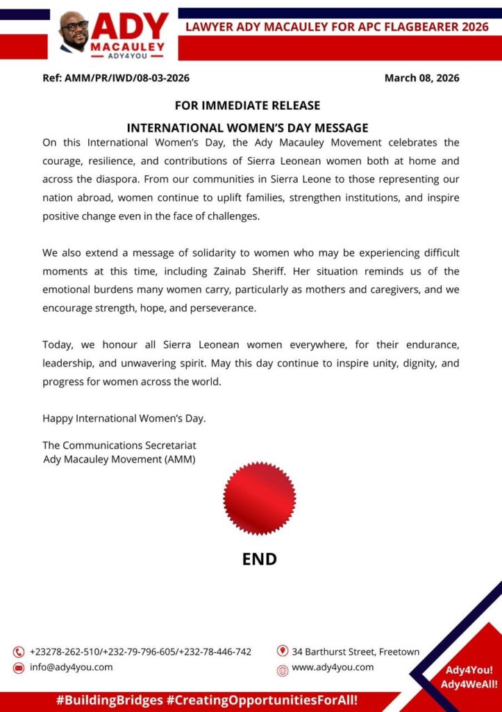 In a statement issued on 8 March 2026, the Movement, led by All People’s Congress (APC) flagbearer aspirant Ady Macauley, acknowledged the vital role women continue to play in shaping families, communities, and national institutions. The message highlighted that Sierra Leonean women, whether within the country or representing the nation abroad, remain instrumental in uplifting society and driving positive change despite numerous challenges.