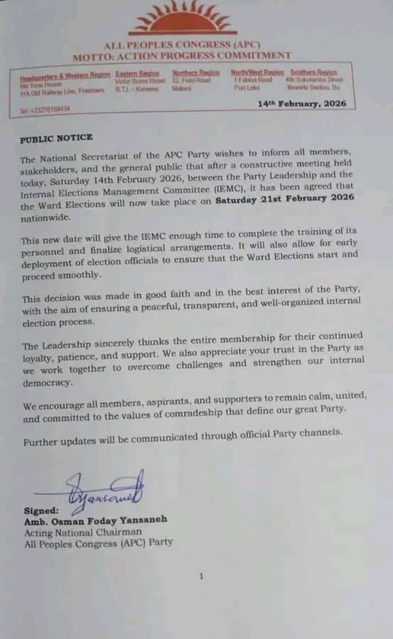 The National Secretariat of the All People’s Congress (APC) has announced a new date for its forthcoming Ward Elections following a high-level engagement between the Party Leadership and the Internal Elections Management Committee (IEMC).