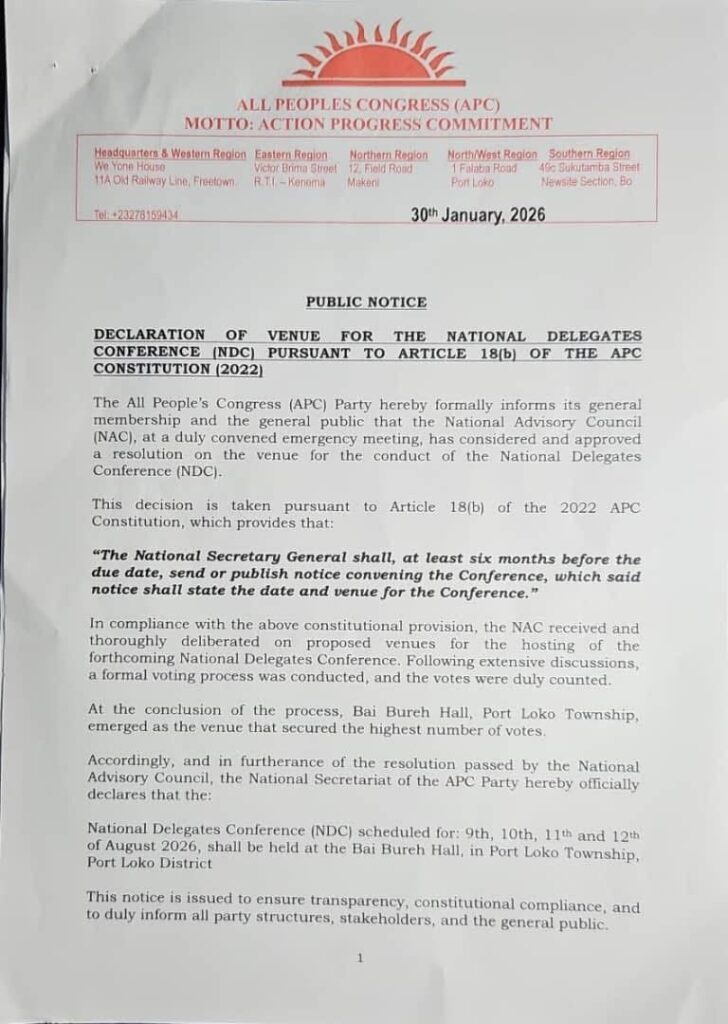 The All People’s Congress (APC) Party has officially announced that Bai Bureh Hall in Port Loko Township will host its forthcoming National Delegates Conference (NDC) scheduled for 9th to 12th August 2026.