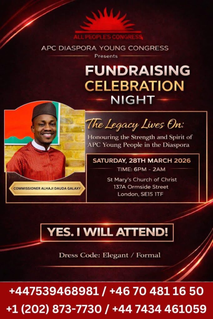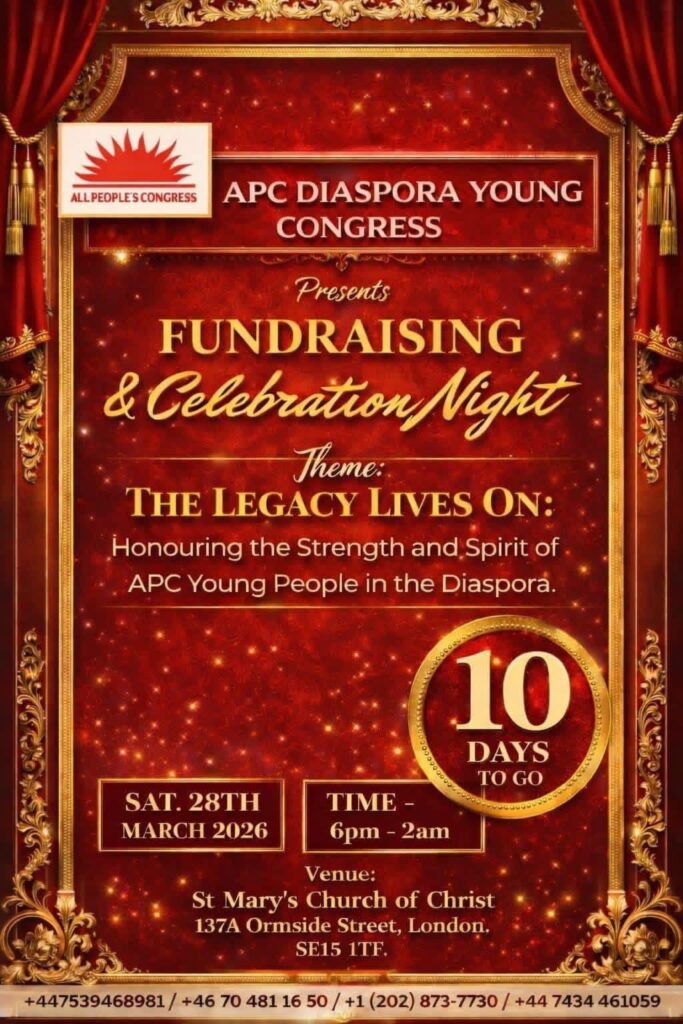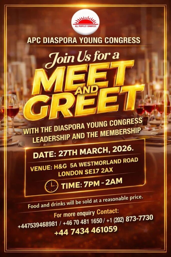 The All People’s Congress Diaspora Young Congress has announced a series of engagements in London, including a meet-and-greet session with its leadership and a fundraising and celebration night scheduled for late March 2026.