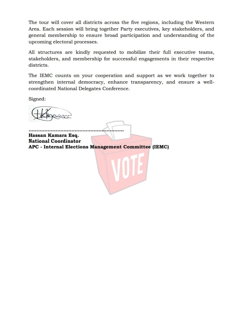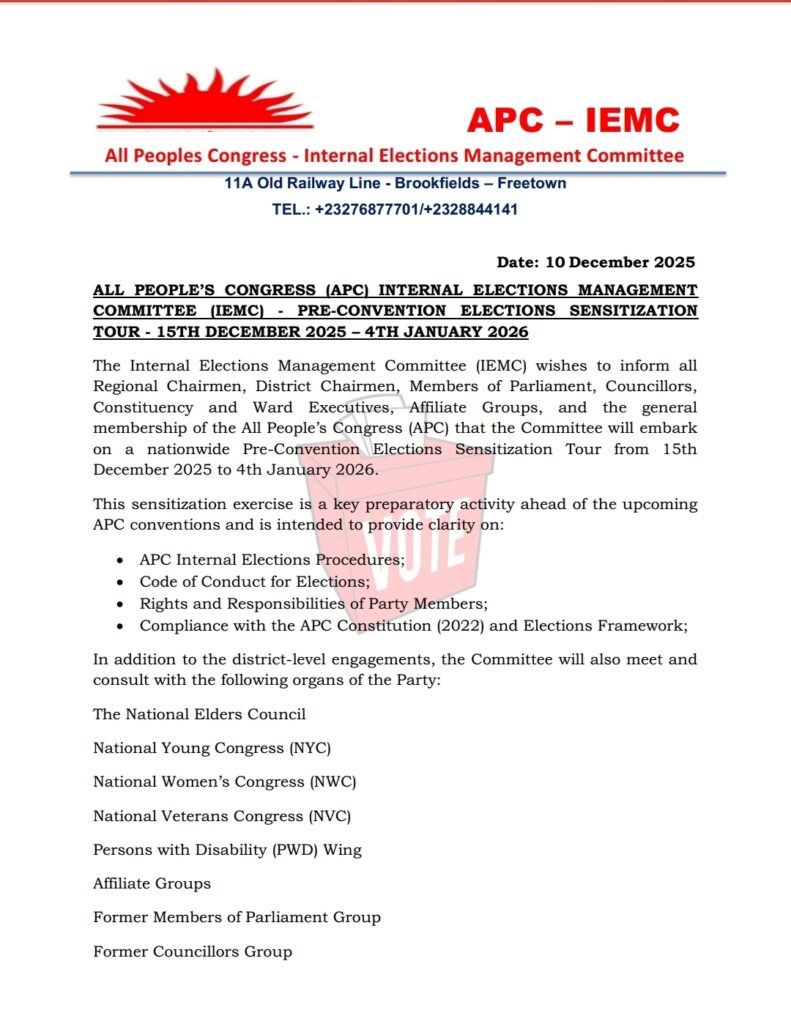 The Internal Elections Management Committee (IEMC) of the All People’s Congress (APC) has announced a nationwide Pre-Convention Elections Sensitization Tour scheduled to run from 15th December 2025 to 4th January 2026.