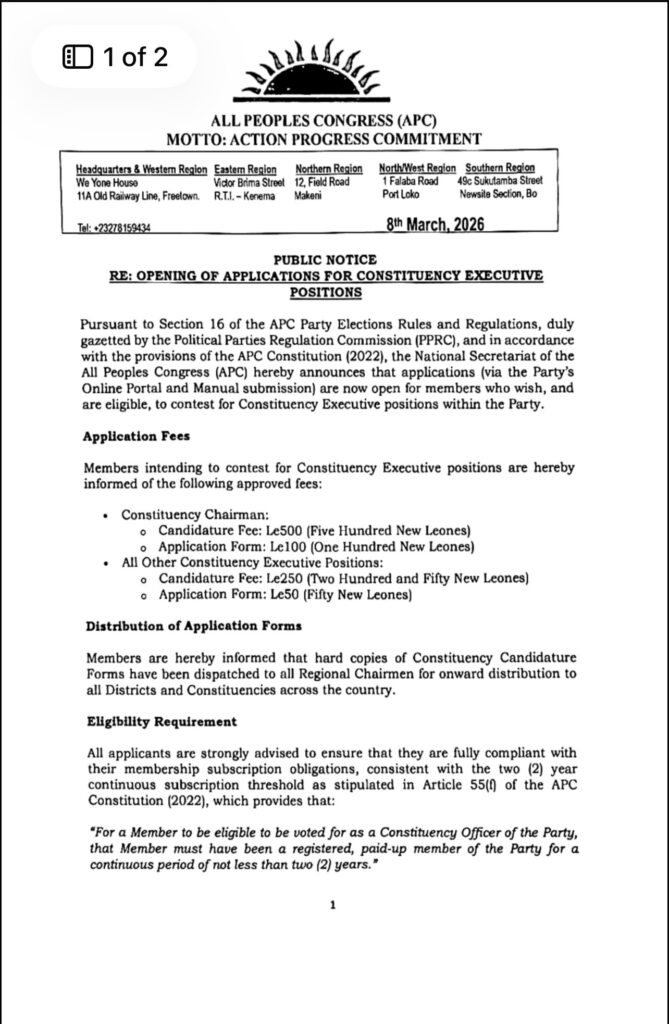 The National Secretariat of the All People’s Congress (APC) has officially announced the opening of applications for members interested in contesting for Constituency Executive positions within the party.