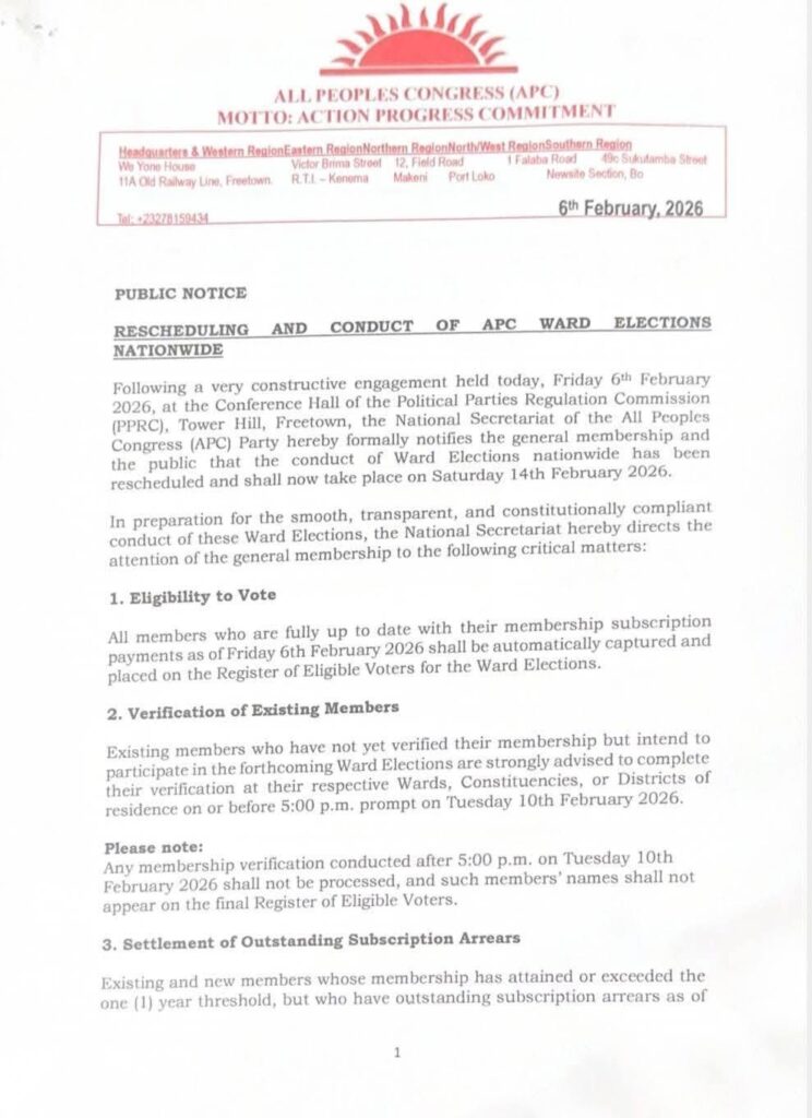 The All People’s Congress (APC) has announced that its nationwide Ward Elections will now take place on Saturday, 14 February 2026, following consultations with the Political Parties Regulation Commission (PPRC).