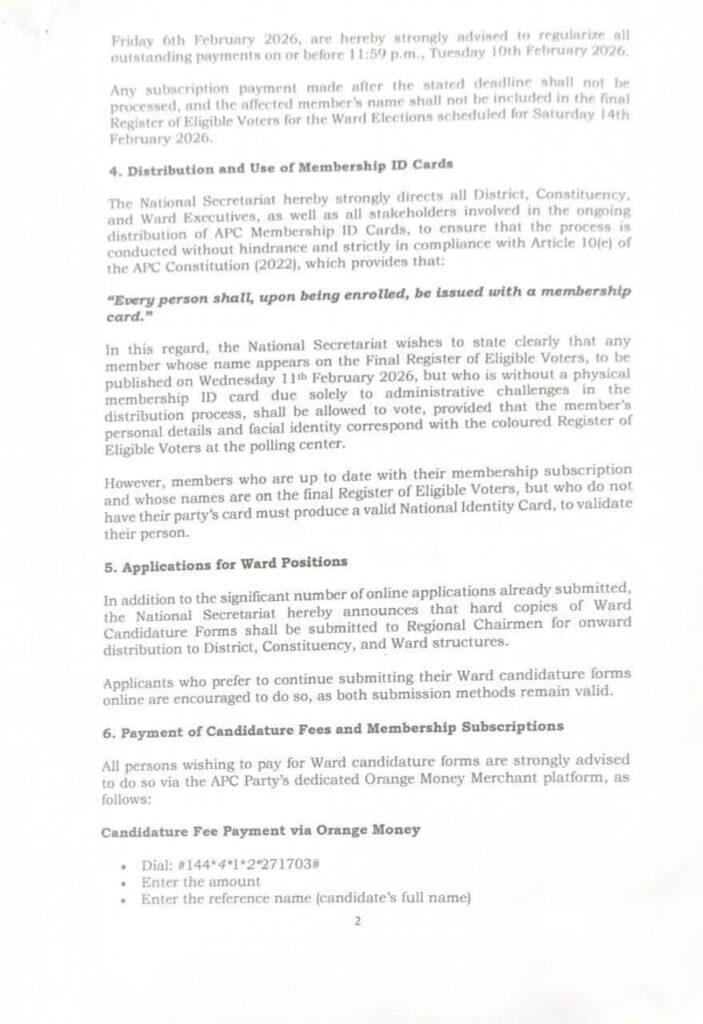 The party also reminded its executives to issue membership cards in accordance with Article 10(e) of the APC Constitution (2022). Members listed on the Final Register, scheduled for publication on 11 February 2026, can vote even if they lack a physical card, provided their details match the register; presentation of a valid National ID may be required.