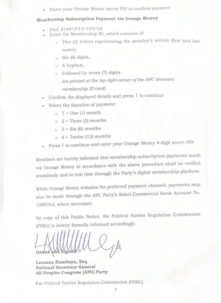 For ward-level positions, the APC confirmed that both online and hard copy submission of Ward Candidature Forms are acceptable. Payments for membership and candidature fees are encouraged via the party’s Orange Money Merchant platform for real-time verification, with Rokel Commercial Bank also available as an alternative.