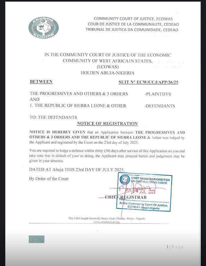 In a move that has raised eyebrows, tickled political nerves, and sent officials scrambling for legal dictionaries, the ECOWAS Court of Justice has officially served the Government of Sierra Leone in connection with a case filed by the opposition Progressive Party, challenging the legitimacy of the country’s 2023 general elections.