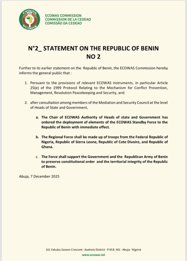 A regional military contingent of the ECOWAS Standby Force will be deployed to Benin with immediate effect.