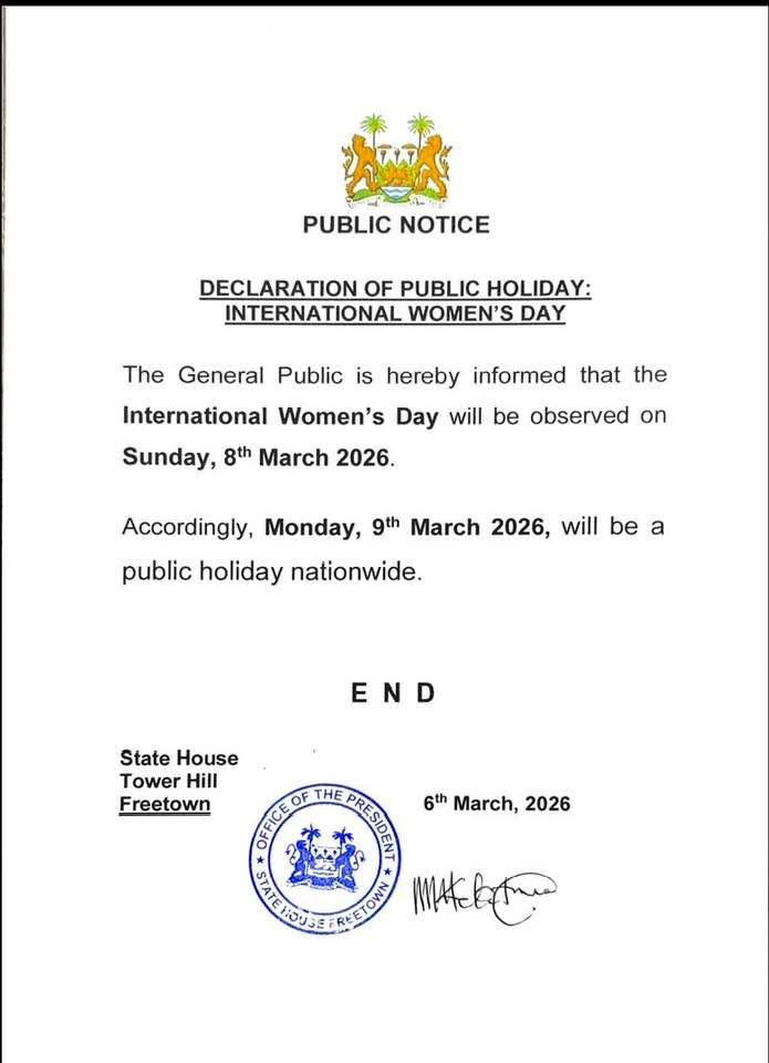 The Government of Sierra Leone has announced that Monday, 9 March 2026, will be observed as a public holiday across the country in recognition of International Women’s Day.