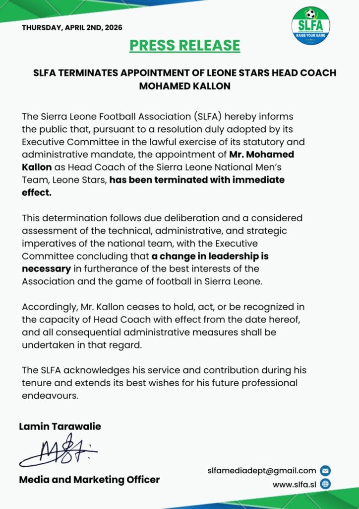 The decision, announced by the SLFA, follows a resolution by the Association’s Executive Committee after a thorough review of the team’s technical, administrative, and strategic direction. The Committee concluded that a change in leadership is necessary to advance the interests of the national team and promote the growth of football in Sierra Leone.