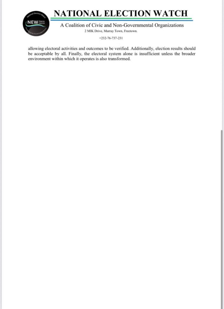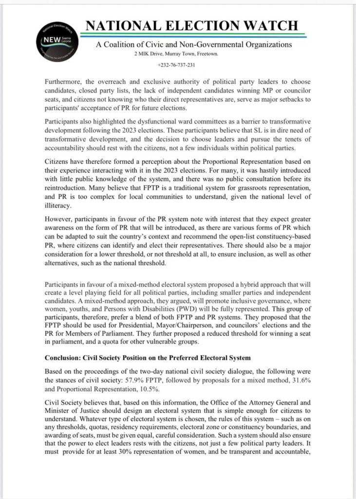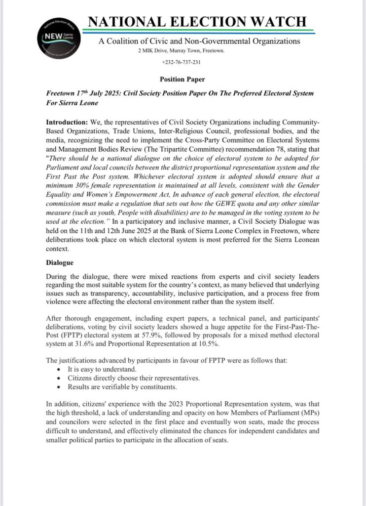 In a Position Paper dated today (17th July 2025), National Election Watch – Sierra Leone, a coalition of civic and non-governmental organizations with representatives including Community-Based Organizations, Trade Unions, the Inter-Religious Council, professional bodies, and the media, has communicated the outcome of the Civil Society Dialogue which was held on the 11th and 12th June 2025 on which electoral system is most preferred for the Sierra Leonean context.