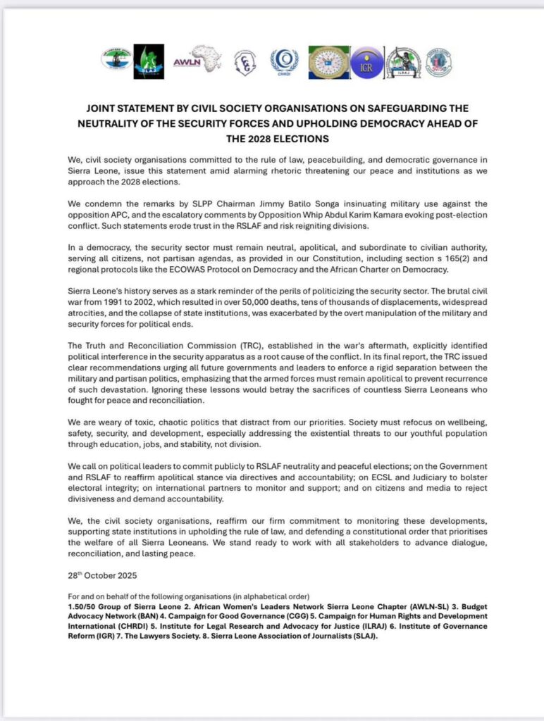 The statement, released today, comes amid recent controversial remarks by political figures, including SLPP Chairman Jimmy Batilo Songa, who allegedly suggested military action against the opposition APC, and Opposition Whip Abdul Karim Kamara, whose comments evoked the possibility of post-election conflict. Civil society leaders described these statements as “alarming rhetoric” that threatens peace, erodes trust in the Republic of Sierra Leone Armed Forces (RSLAF), and risks reigniting societal divisions.