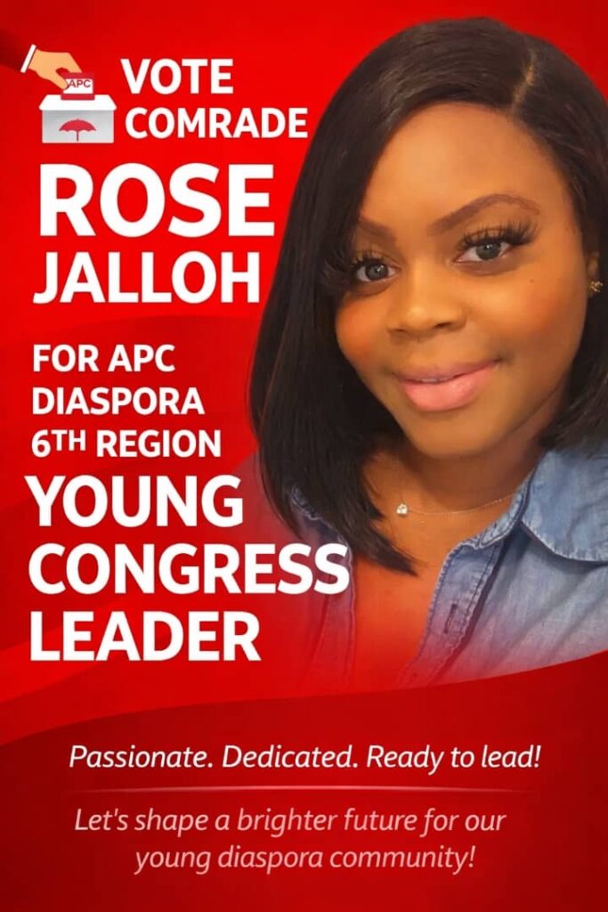 In her campaign, Comrade Jalloh emphasizes the importance of inclusion, opportunity, and sustainable growth for young APC members in the Diaspora. She calls on party members and supporters to unite behind her leadership to advance the interests of youth and build stronger ties across borders.