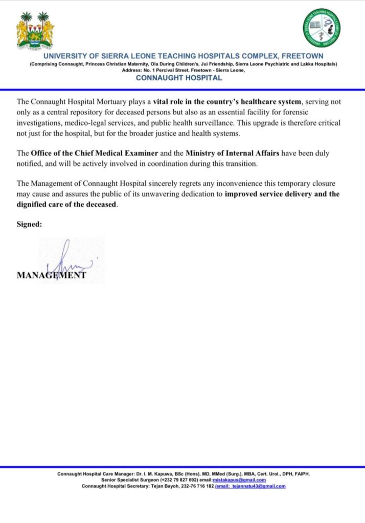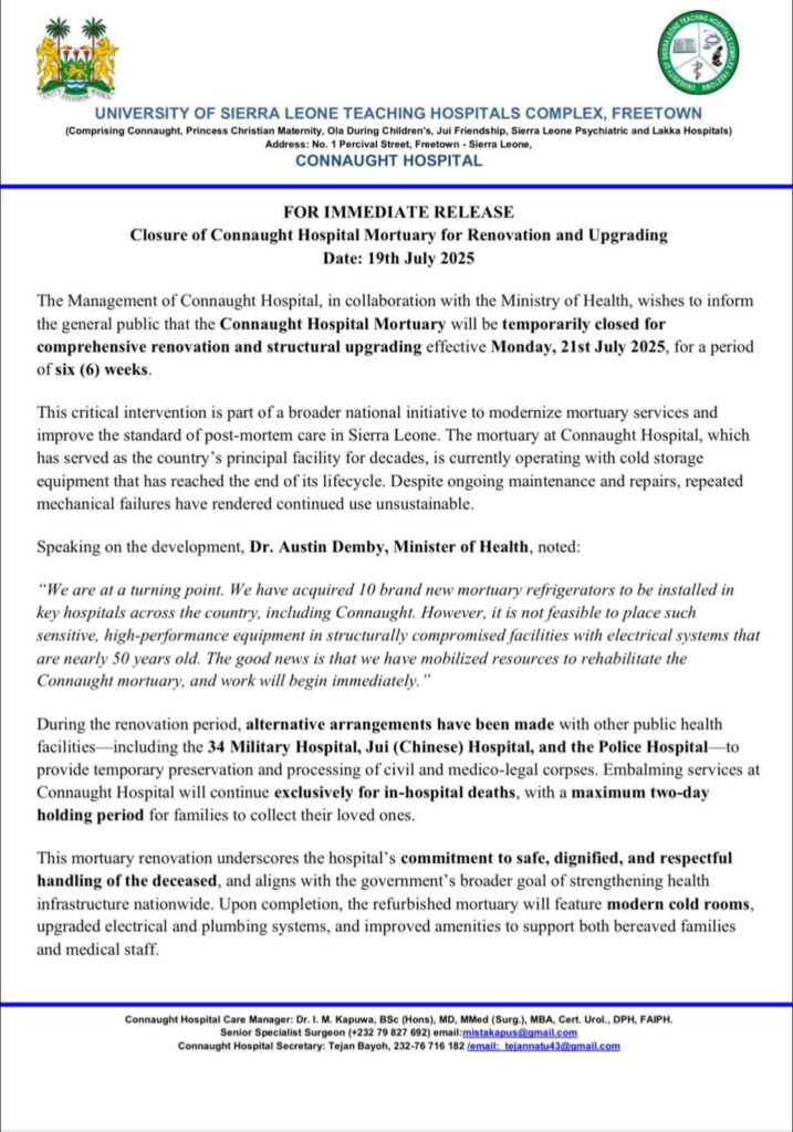 The Connaught Hospital Mortuary, Sierra Leone’s principal facility for post-mortem care, has been officially closed for a six-week period beginning Monday, 21st July 2025, to allow for comprehensive renovation and structural upgrading.