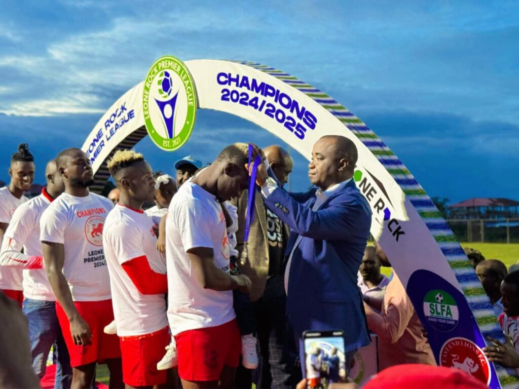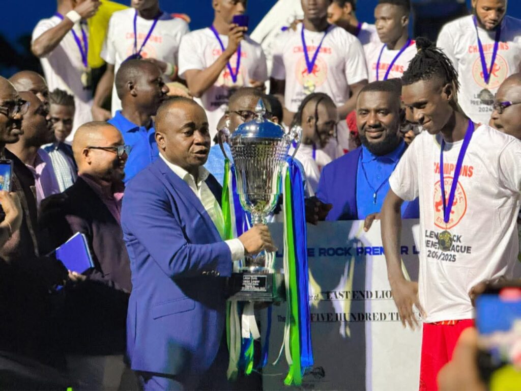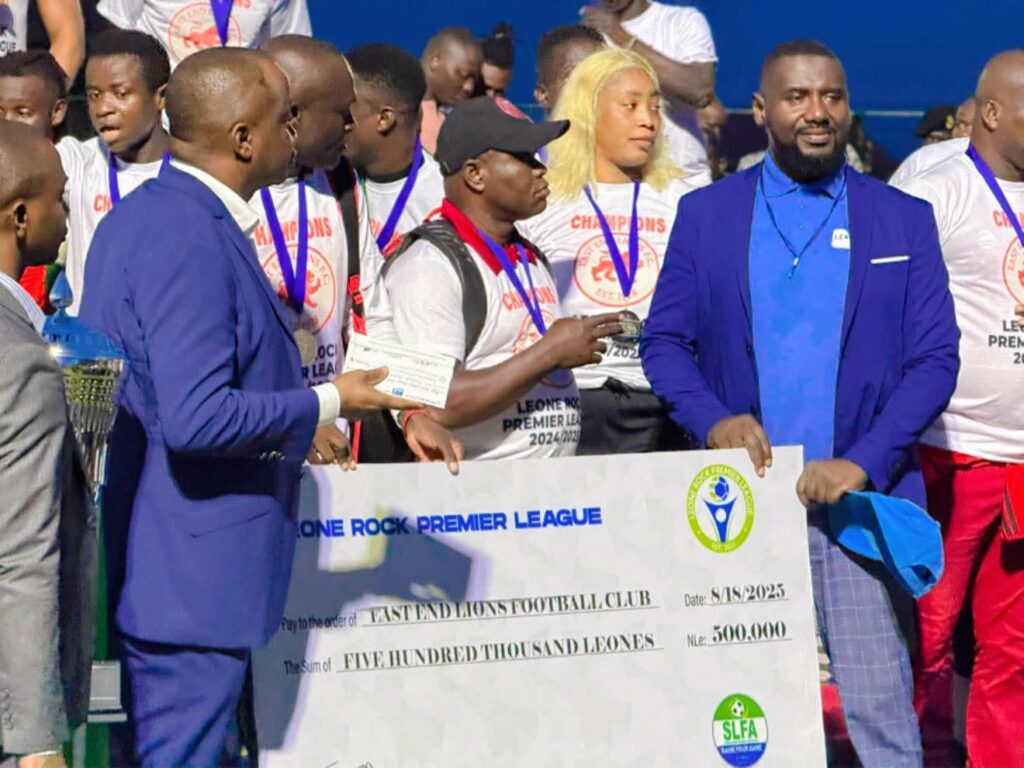 The Sierra Leone Football Association (SLFA) President, Babadi Kamara, officially handed over medals and the championship trophy to East End Lions, winners of the 2025 Leone Rock Premier League.