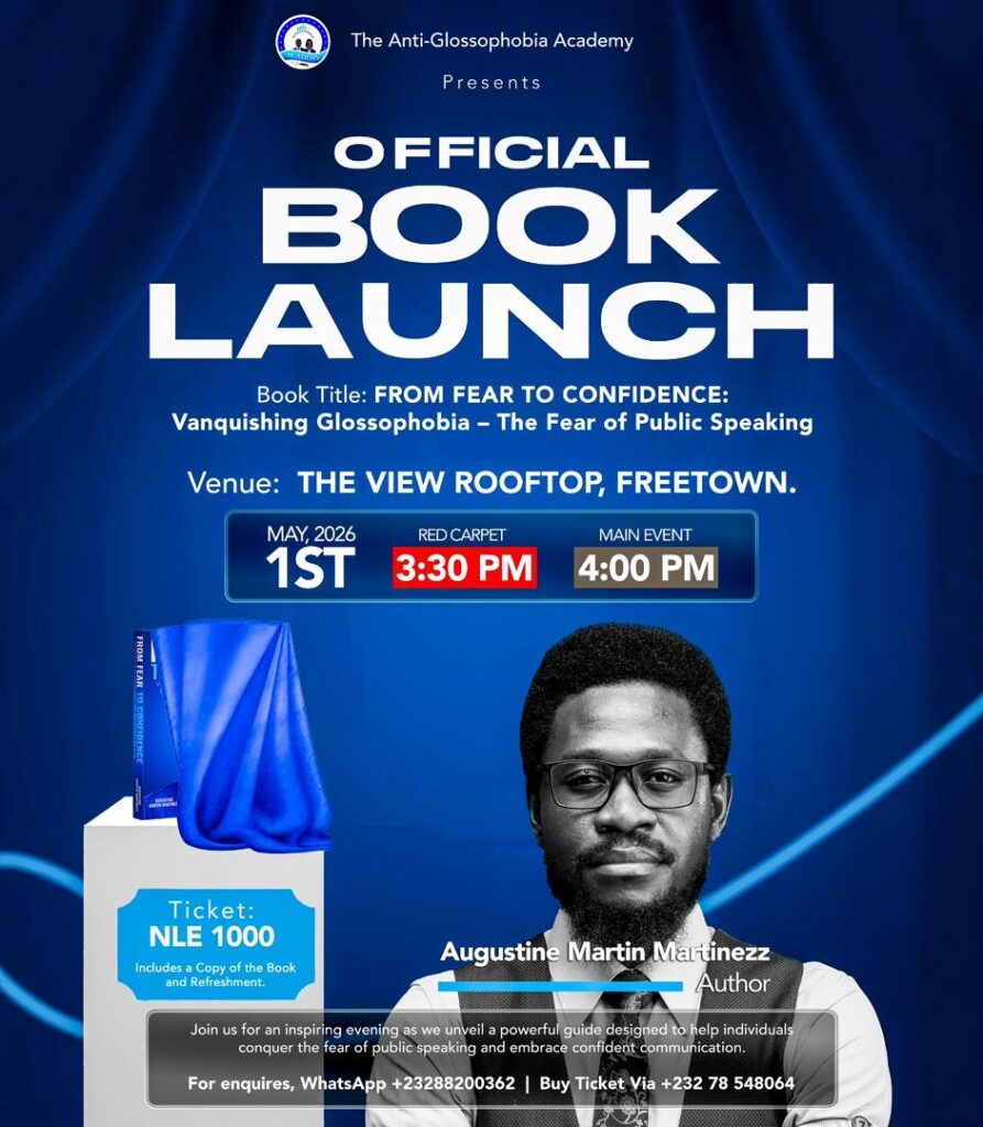 On the evening of May 1, 2026, Freetown will host more than a book launch, it will witness the powerful story of transformation, resilience, and purpose as Augustine Martin Martinezz unveils his debut book, From Fear to Confidence: Vanquishing Glossophobia – The Fear of Public Speaking.