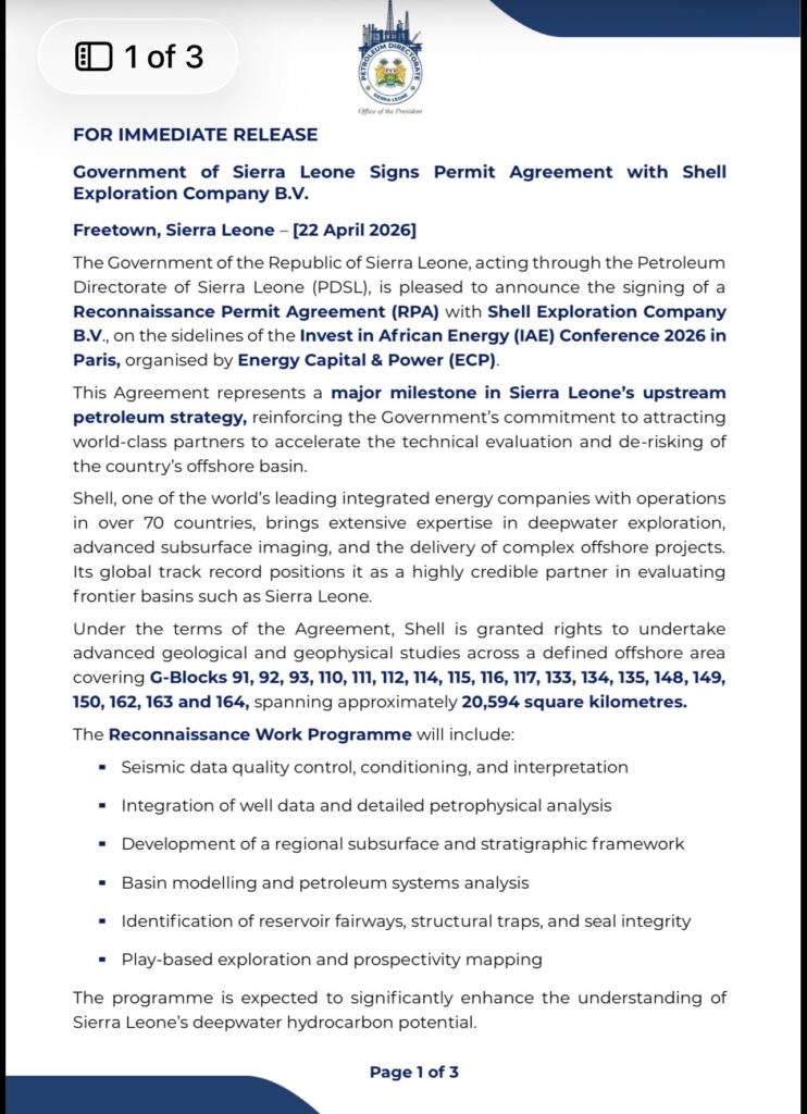 The Government of Sierra Leone has signed a Reconnaissance Permit Agreement (RPA) with Shell Exploration Company B.V., marking a significant step in the country’s efforts to advance its upstream petroleum sector.