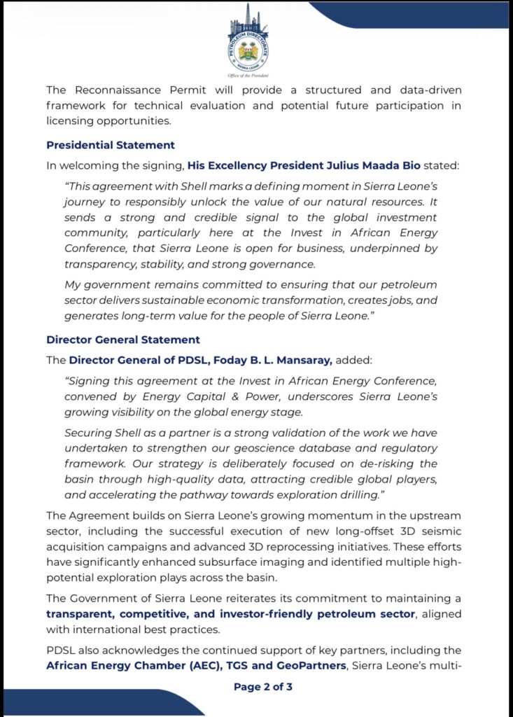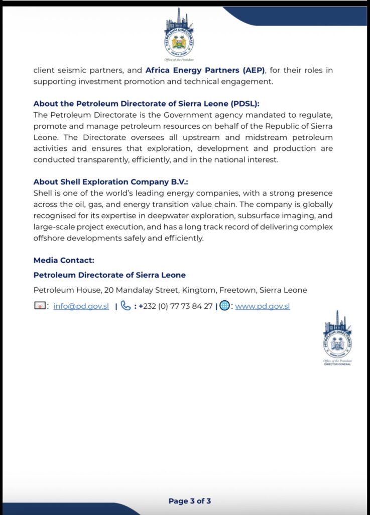 The Director General of PDSL, Foday B. L. Mansaray, said securing Shell as a partner reflects growing global confidence in Sierra Leone’s petroleum sector. He added that the government’s strategy is focused on strengthening geoscience data, attracting reputable investors, and accelerating progress toward exploration drilling.