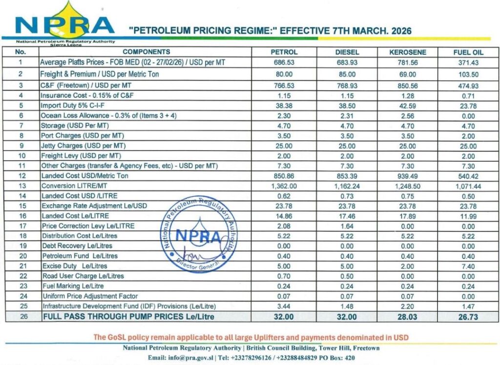 The Government of Sierra Leone, through the National Petroleum Regulatory Authority (NPRA), has announced an increase in the pump price of fuel from Le28 to Le32 per litre, effective 7th March 2026.
