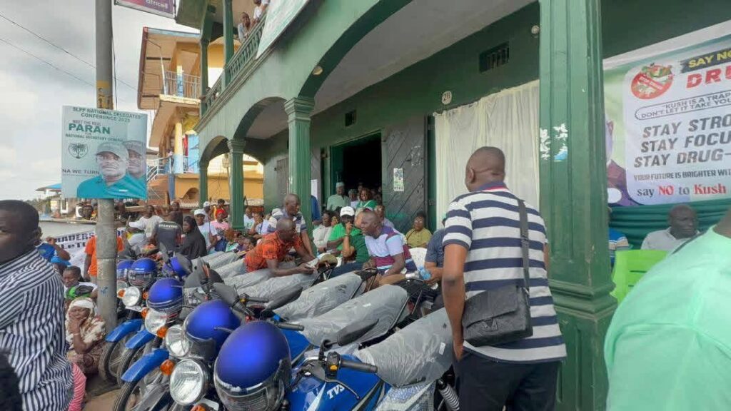 He also presented 10 motorbikes to Young Generation Leaders and 2 motorbikes to SLPP artists, valued at NLe 360,000 (USD 15,000), bringing the total contribution to NLe 860,000 (USD 40,000).