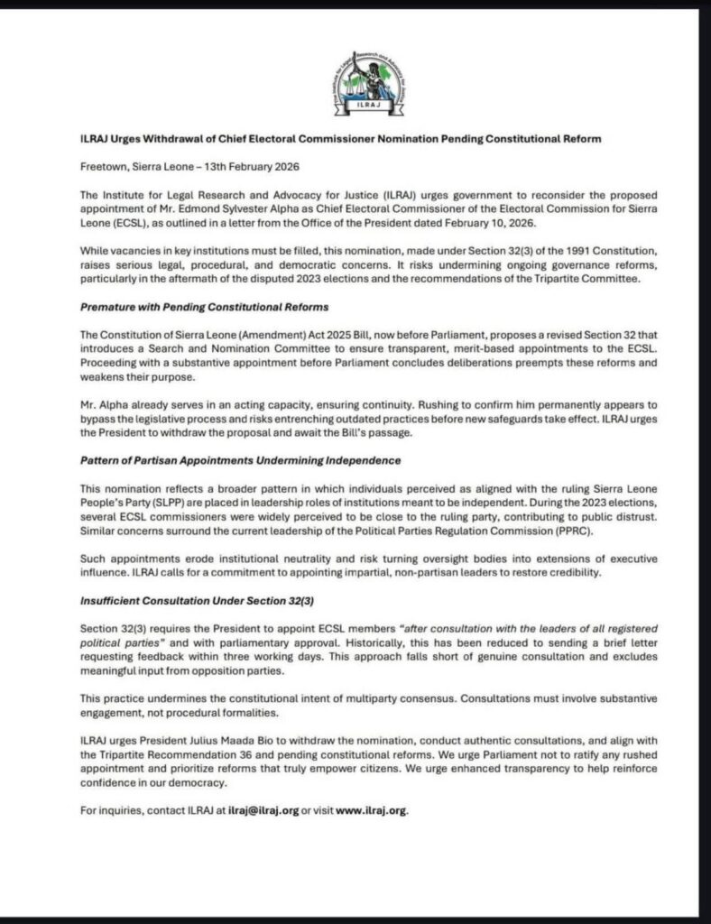 The Institute for Legal Research and Advocacy for Justice (ILRAJ) has called on President Julius Maada Bio to reconsider the proposed appointment of Edmond Sylvester Alpha as Chief Electoral Commissioner of the Electoral Commission for Sierra Leone (ECSL).