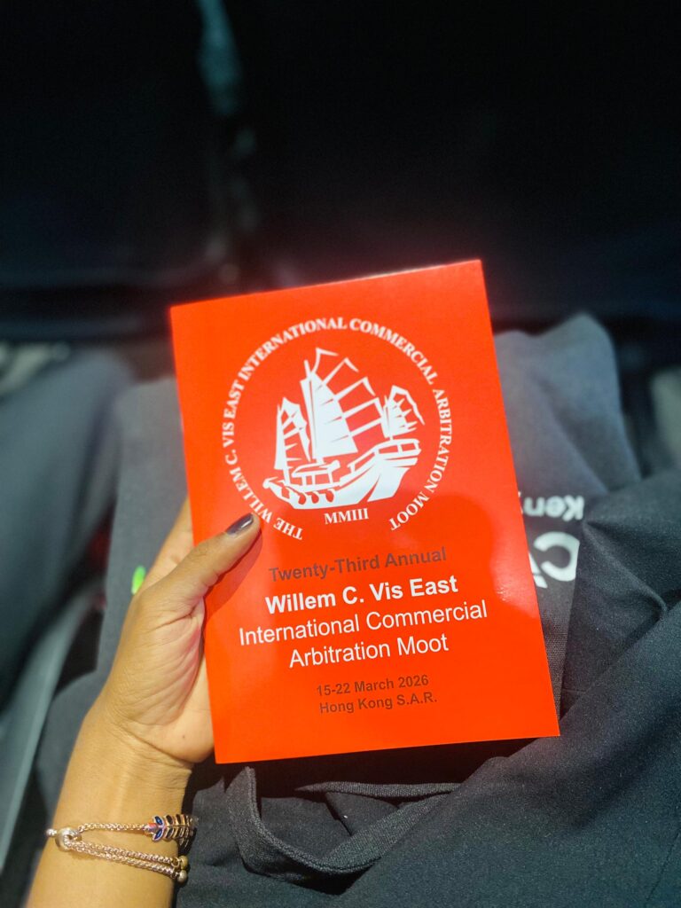 During the hearing, both teams presented detailed legal arguments before a panel of arbitrators, following a format that mirrors real international arbitration proceedings. Students applied principles of international commercial law, arbitration procedures, and persuasive advocacy to defend their positions.