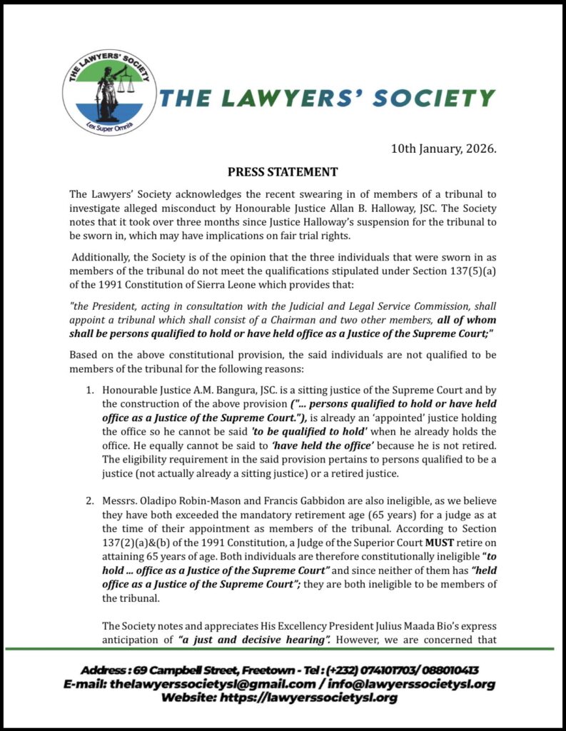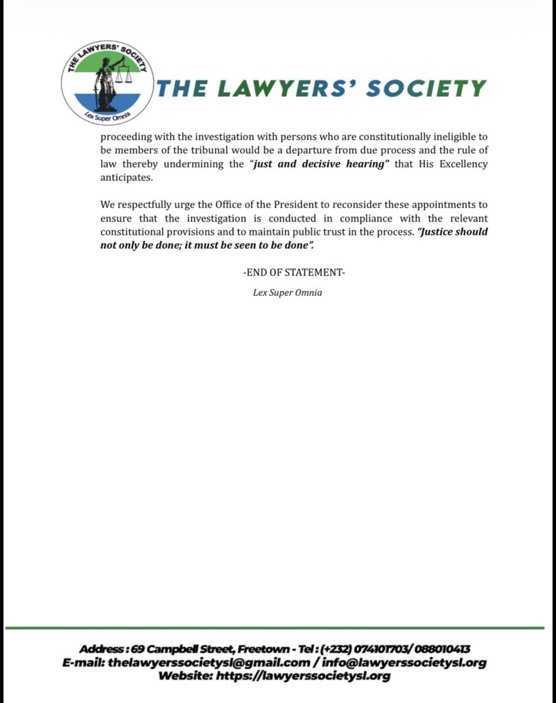 While acknowledging President Julius Maada Bio’s expressed desire for “a just and decisive hearing,” the Lawyers’ Society warned that proceeding with a tribunal whose members are constitutionally ineligible would amount to a departure from due process and could undermine public confidence in the investigation.
