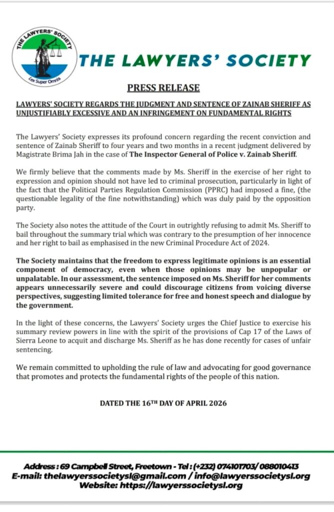 In a press release issued on 16 April 2026, the Society referenced the ruling delivered by Magistrate Brima Jah in the case of Inspector General of Police v. Zainab Sheriff, in which she was sentenced to four years and two months.