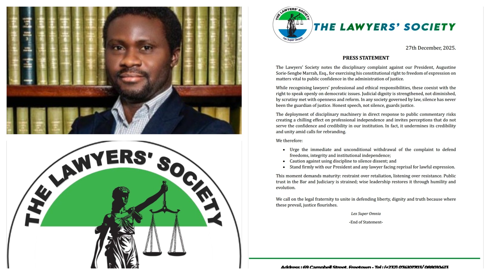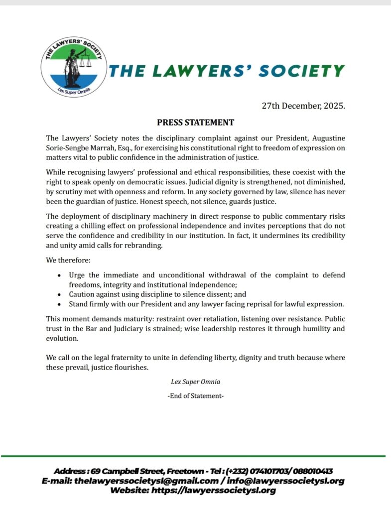The Lawyers’ Society has issued a strong press statement expressing concern over a disciplinary complaint filed against its President, Augustine Sorie-Sengbe Marrah, Esq., describing the move as a threat to freedom of expression and professional independence within the legal profession.