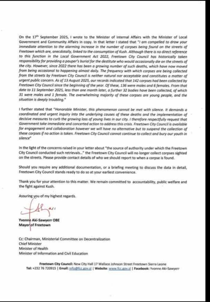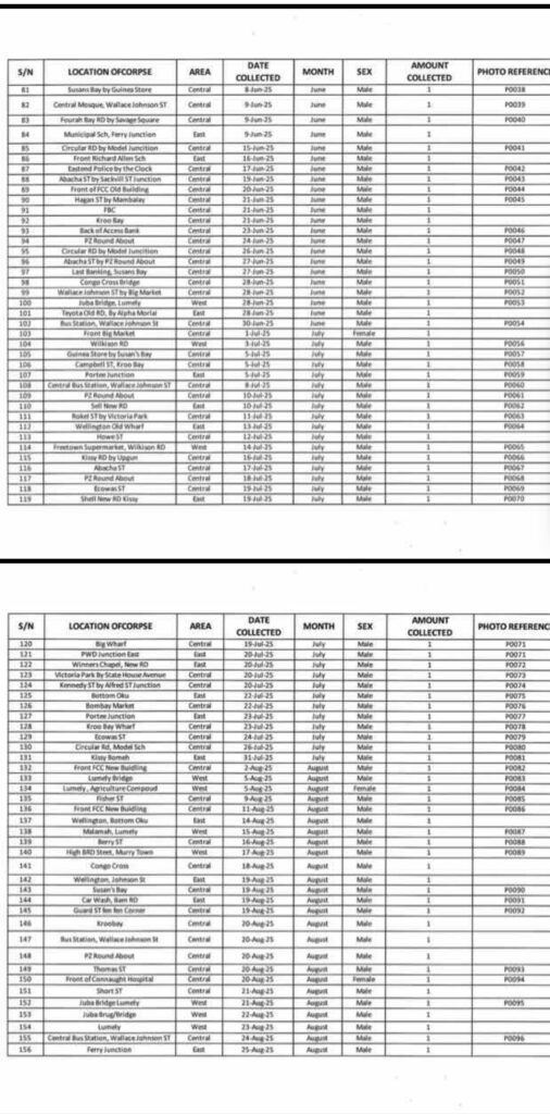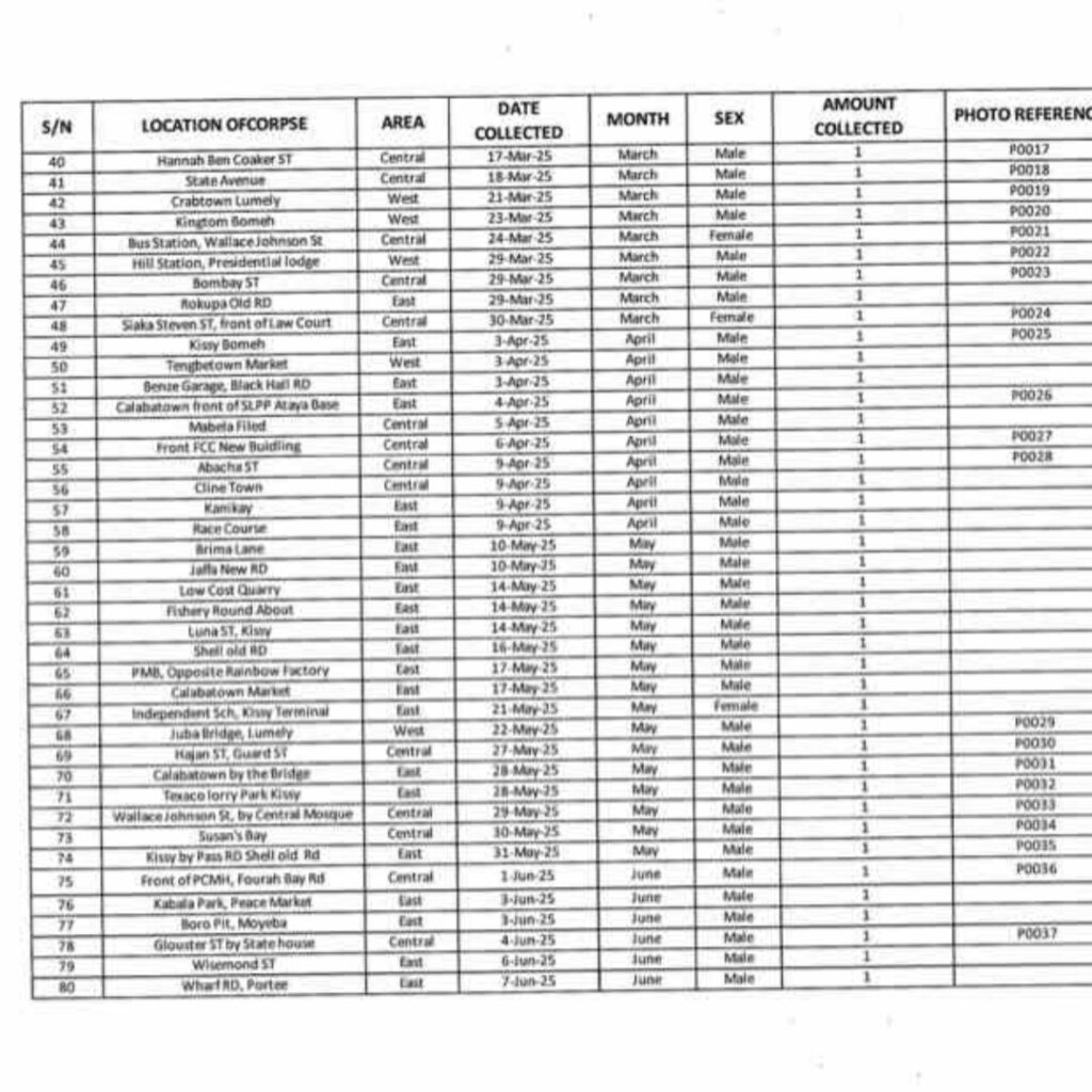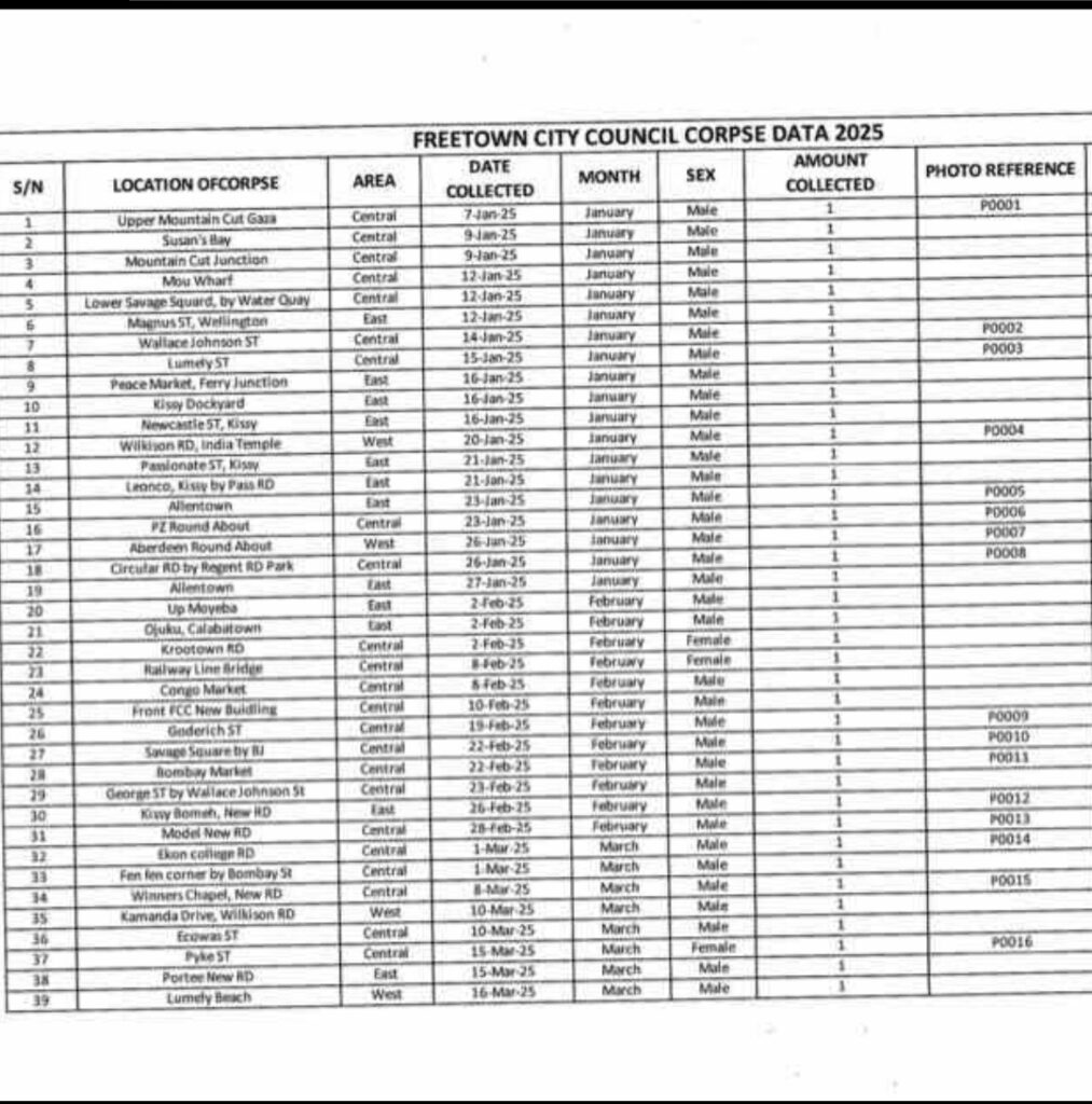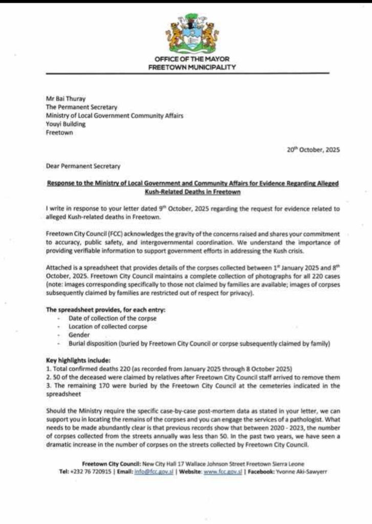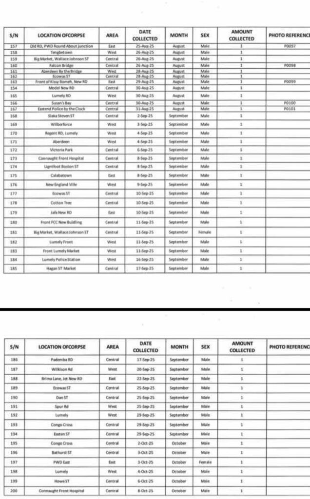 In a letter dated 20 October 2025 and addressed to the Permanent Secretary of the Ministry, the Mayor confirmed that the Freetown City Council (FCC) has compiled and submitted a detailed spreadsheet of corpses collected across the city between 1 January and 8 October 2025.
