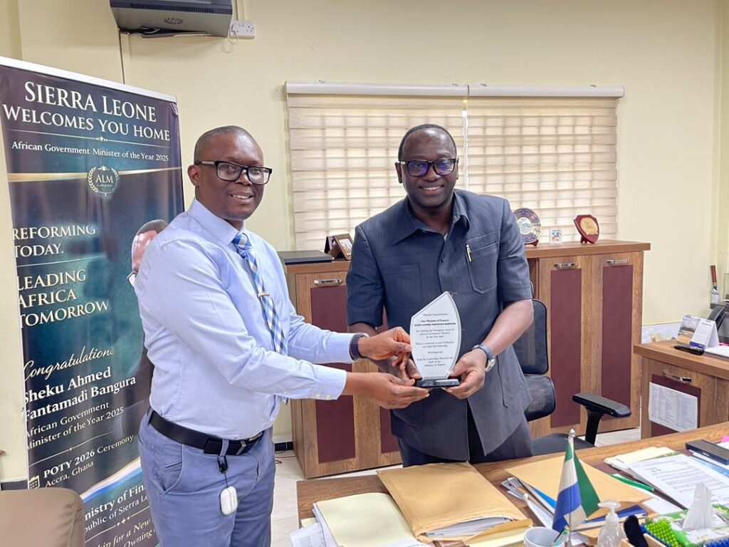 Presenting the appreciation plaque, Financial Secretary Matthew Dingie congratulated the Minister, describing the award as a testament to his visionary leadership. He emphasized that the presentation was intended to associate the Ministry’s staff with the achievement and to express gratitude for Minister Bangura’s guidance in advancing Sierra Leone’s economic management.