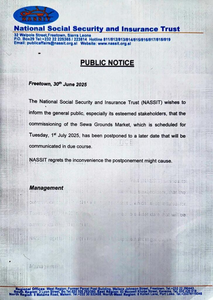 The National Social Security and Insurance Trust (NASSIT) has announced the postponement of the much-anticipated commissioning of the Sewa Grounds Market, which was originally scheduled to take place on Tuesday, 1st July 2025.