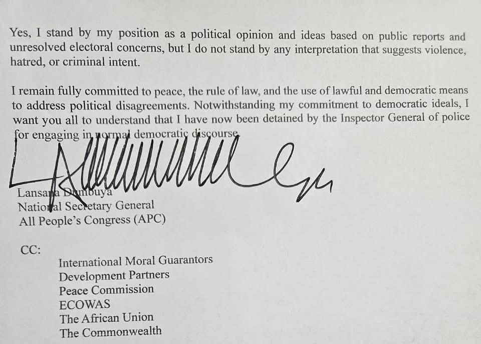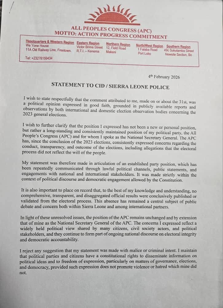 The All People’s Congress (APC) National Secretary General has taken a firm stand following his detention by the Sierra Leone Police, asserting that his remarks on the 2023 general elections were lawful political opinions and warning against attempts to intimidate political voices.