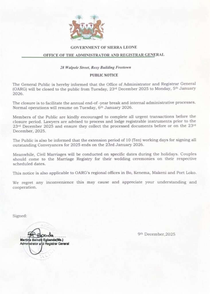 The Office of the Administrator and Registrar General (OARG) has announced that all its offices, including regional branches in Bo, Kenema, Makeni, and Port Loko, will be closed to the public from Tuesday, 23rd December 2025 to Monday, 5th January 2026.