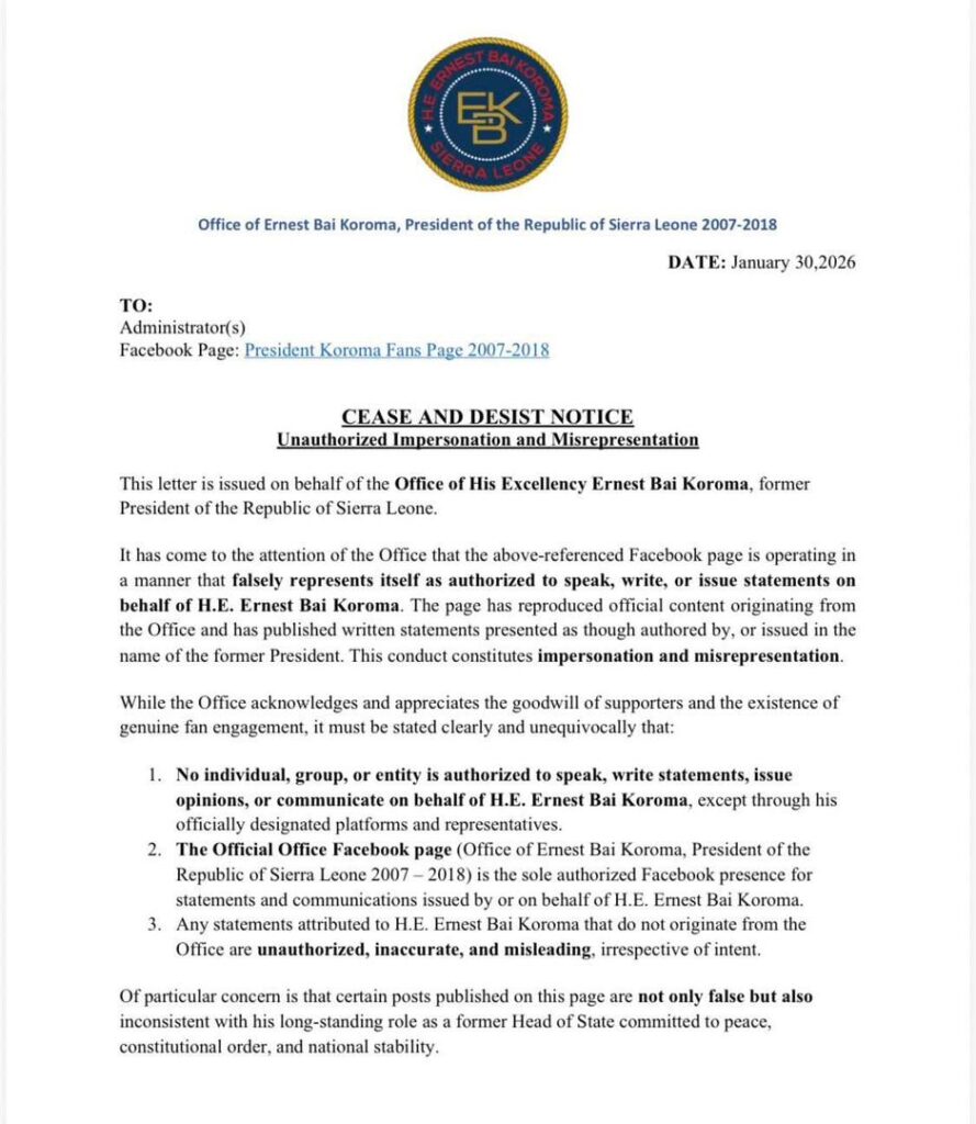 In a statement issued on Thursday, the Office distanced itself from publications made by a Facebook page operating under the name “President Koroma Fans Page 2007–2018,” describing the content as fraudulent and not reflective of the views, position, or voice of former President Koroma.