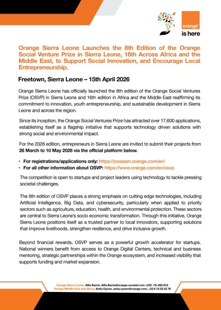 Orange Sierra Leone has officially launched the 8th edition of the Orange Social Ventures Prize (OSVP) in Sierra Leone and 16th edition in Africa and the Middle East reaffirming its commitment to innovation, youth entrepreneurship, and sustainable development in Sierra Leone and across the region.