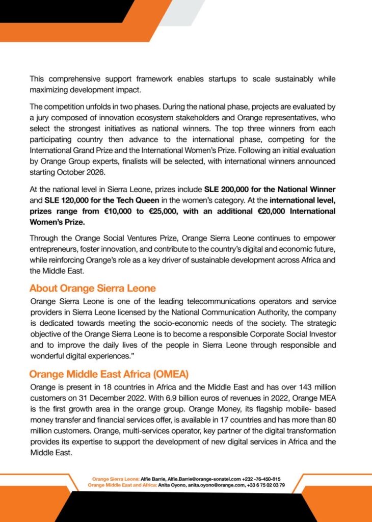 Through the Orange Social Ventures Prize, Orange Sierra Leone continues to empower entrepreneurs, foster innovation, and contribute to the country’s digital and economic future, while reinforcing Orange’s role as a key driver of sustainable development across Africa and the Middle East.
