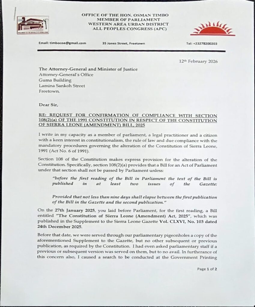 Honourable Osman Timbo has formally written to the Attorney-General and Minister of Justice, Alpha Sesay, requesting confirmation of compliance with Section 108(2)(a) of the Constitution of Sierra Leone in respect of the Constitution of Sierra Leone (Amendment) Bill, 2025.