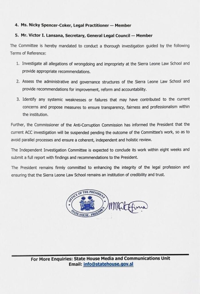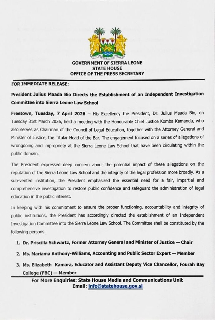 President Julius Maada Bio has directed the establishment of an independent investigation committee to examine allegations of wrongdoing and impropriety at the Sierra Leone Law School.
