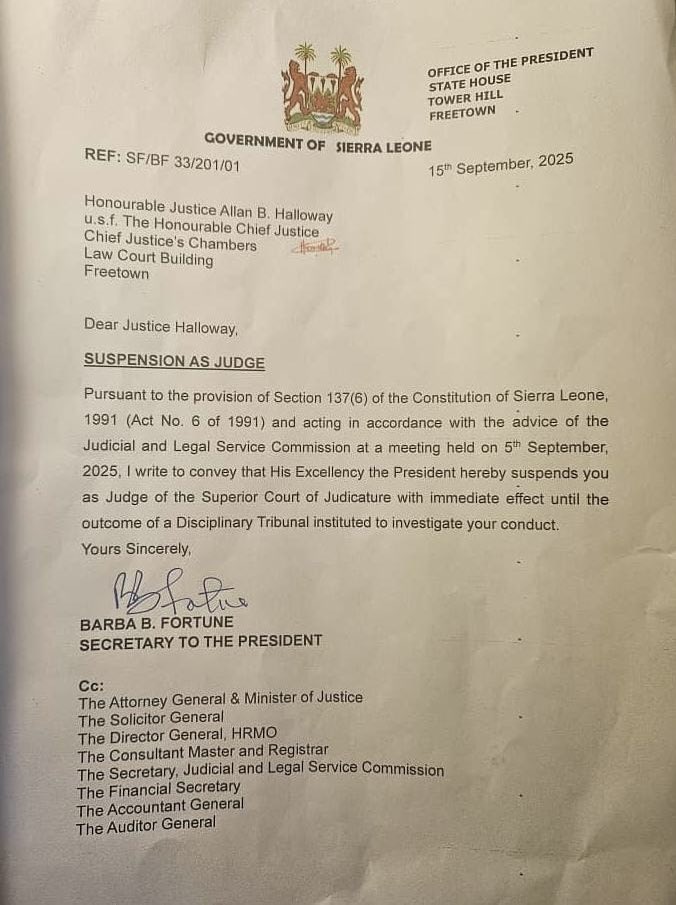 A separate order issued on 16 September 2025 by Chief Justice and JLSC Chairman, Honourable Justice Komba Kamanda, confirmed that Justice Halloway is interdicted as directed by the President’s letter.