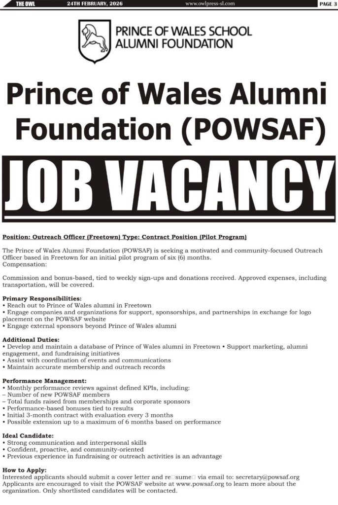 The Prince of Wales Alumni Foundation (POWSAF) has announced a job vacancy for the position of Outreach Officer based in Freetown as part of a six-month pilot programme aimed at strengthening alumni engagement and fundraising efforts.