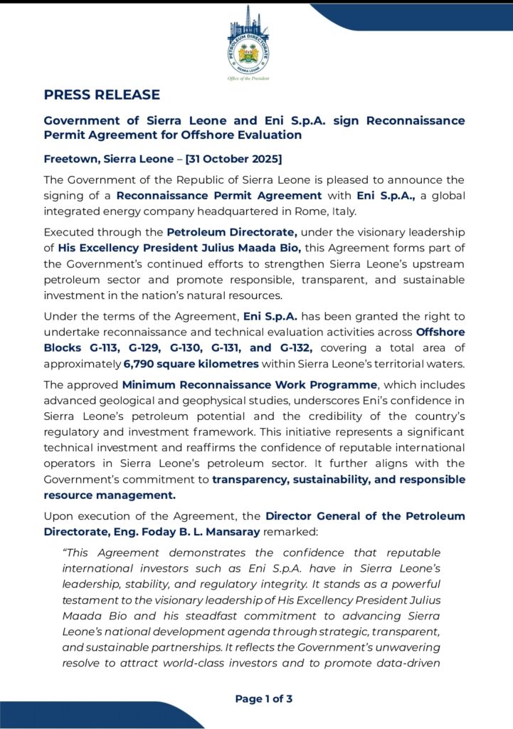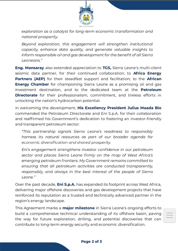 “This Agreement reflects the confidence that reputable international investors such as Eni S.p.A. have in Sierra Leone’s leadership, stability, and regulatory integrity,” Eng. Mansaray stated.