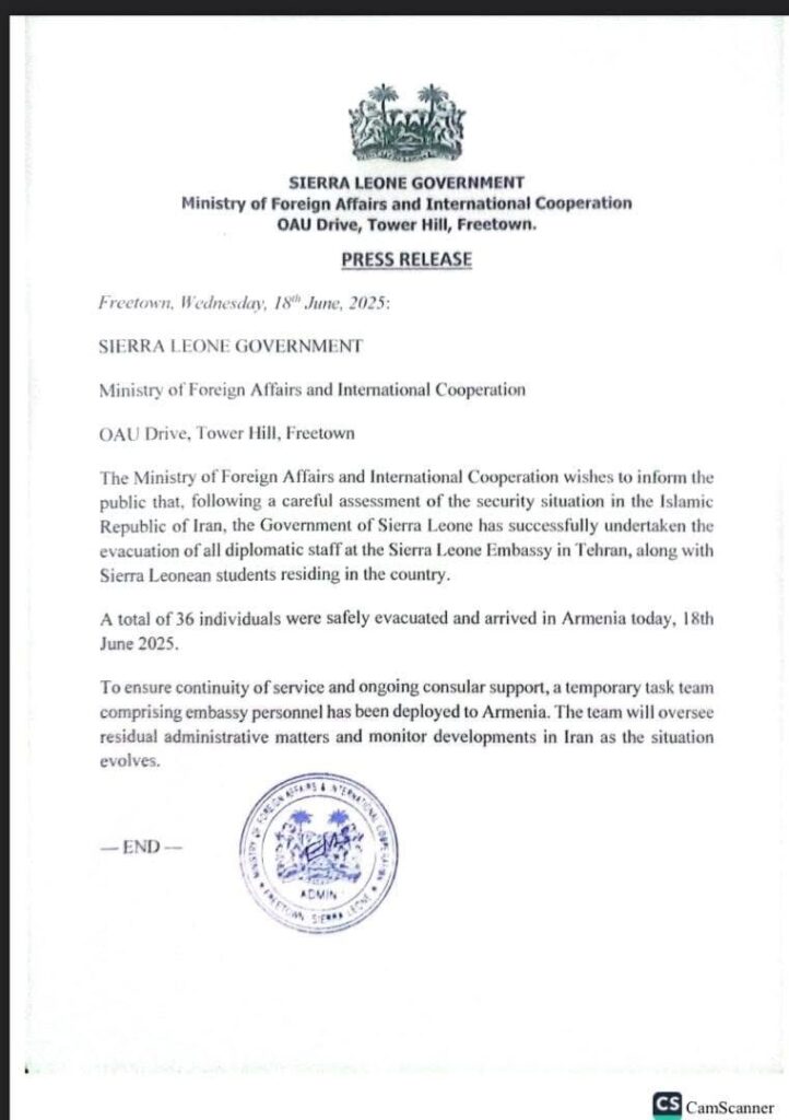 The Government of Sierra Leone has announced the successful evacuation of its diplomatic personnel and citizens residing in the Islamic Republic of Iran, citing security concerns.