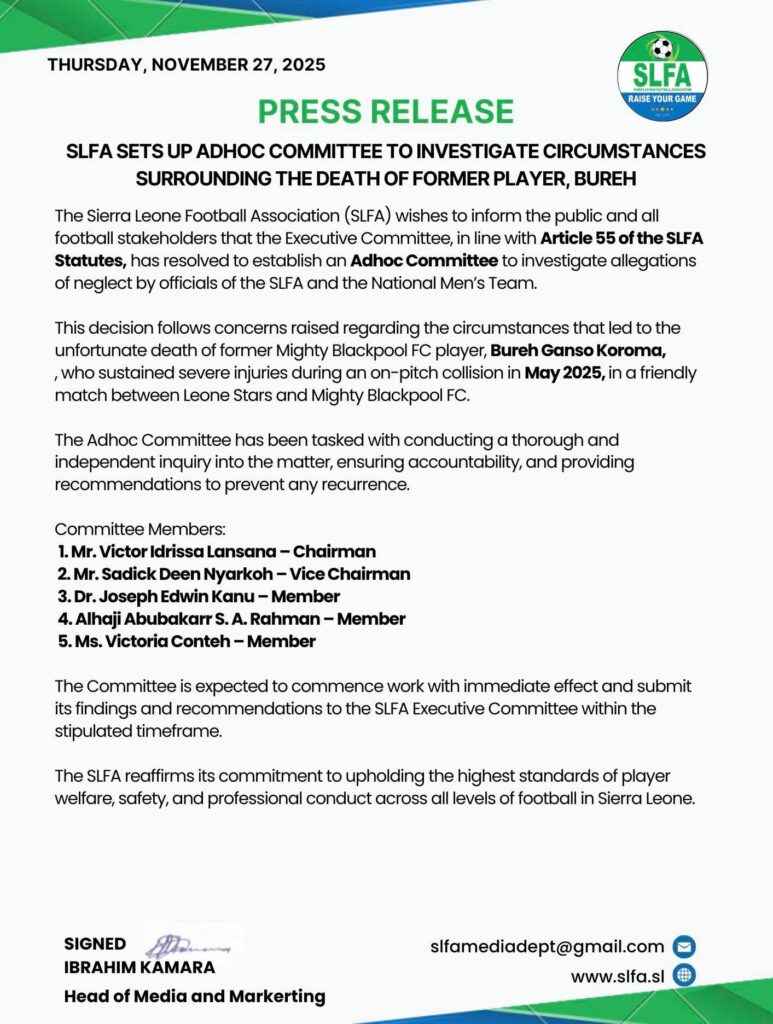 The Sierra Leone Football Association (SLFA) has established an Adhoc Committee to investigate allegations of neglect surrounding the circumstances that led to the death of former Mighty Blackpool FC player, Bureh Ganso Koroma.