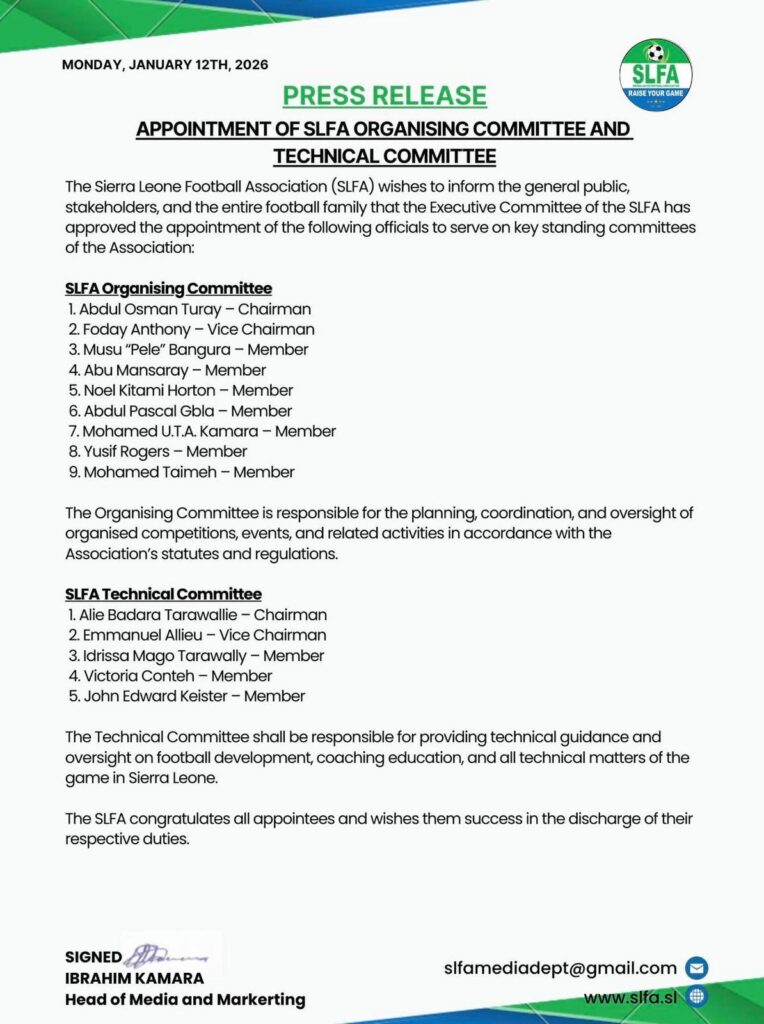 The Sierra Leone Football Association (SLFA) has announced the appointment of new members to its Organising Committee and Technical Committee, following approval by the Association’s Executive Committee.