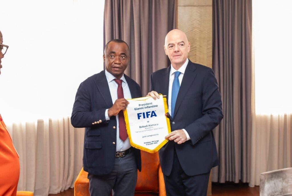 Sierra Leone Football Association (SLFA) President, ๐๐๐๐๐๐ข ๐๐๐ฆ๐๐ซ๐, today Sunday, October 5th, held a high-level one-on-one meeting with FIFA President ๐๐ข๐๐ง๐ง๐ข ๐๐ง๐๐๐ง๐ญ๐ข๐ง๐จ in Kinshasa, on the sidelines of the ๐๐๐ญ๐ก ๐๐๐ ๐๐๐ง๐๐ซ๐๐ฅ ๐๐ฌ๐ฌ๐๐ฆ๐๐ฅ๐ฒ scheduled for Monday, October 6th, in the Democratic Republic of Congo.