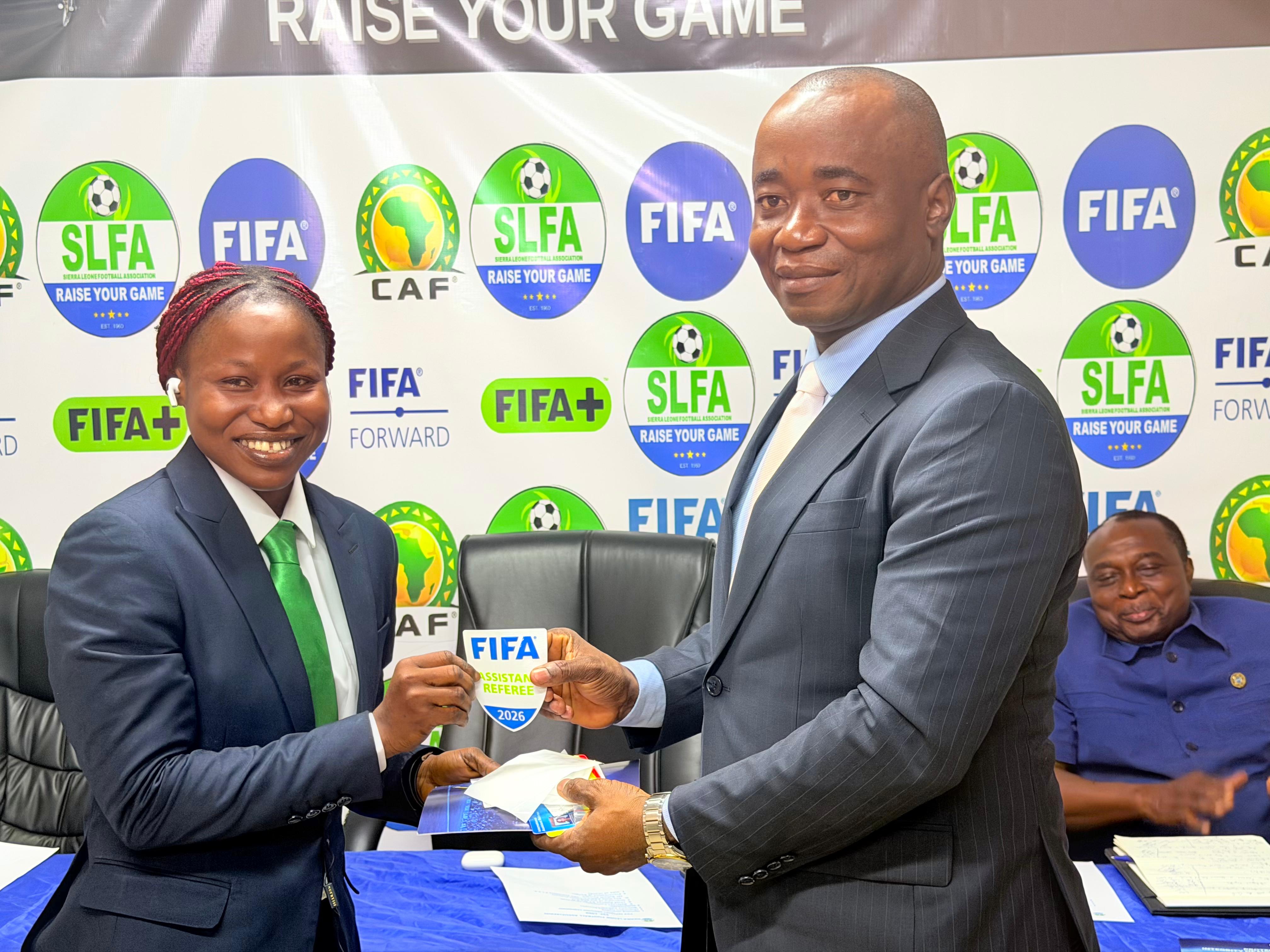 The President of the Sierra Leone Football Association (SLFA), ๐๐ซ. ๐๐๐๐๐๐ข ๐๐๐ฆ๐๐ซ๐, has officially presented ๐ ๐๐ ๐ ๐๐๐๐ ๐๐ฌ ๐ญ๐จ ๐ญ๐๐ง ๐ซ๐๐๐๐ซ๐๐๐ฌ ๐๐ง๐ ๐๐ฌ๐ฌ๐ข๐ฌ๐ญ๐๐ง๐ญ ๐ซ๐๐๐๐ซ๐๐๐ฌ approved to officiate international matches in 2026.