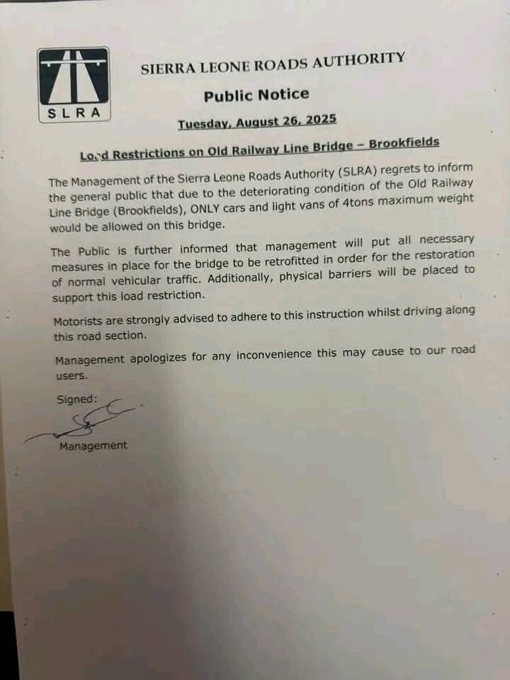 The Sierra Leone Roads Authority (SLRA) has announced immediate load restrictions on the Old Railway Line Bridge at Brookfields, citing safety concerns over the deteriorating condition of the structure.