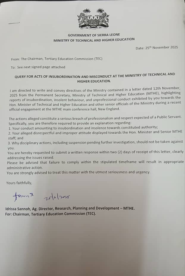 The suspension marks a significant escalation in the standoff between the Ministry and the regulatory body responsible for overseeing tertiary education in Sierra Leone, as investigations continue into the allegations of misconduct and institutional insubordination.
