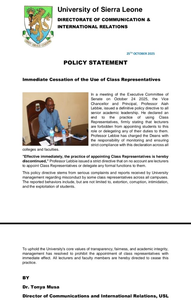 In a decisive move to uphold academic integrity and student welfare, the Vice Chancellor and Principal of the University, Professor Aiah Lebbie, has issued a formal directive ending the practice of appointing Class Representatives. The announcement was made during a meeting of the Executive Committee of the Senate on October 24, 2025.